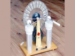 在上“力的分解”课时,拿出演示器,将人字梁张开,让下弦杆间的松紧带拉直,成一线,把人字梁平放在由四条松紧带组成的托架上,在人字梁的承重钩上挂上重物,只见代表墙壁的四条松紧带被压而下弯,同时下弦杆间松紧带被拉长,不用老师多解释,学生就能明白人字梁所受的作用力被人字梁的上弦杆分解成两个相同的压力,进而又分解成向下对墙壁的压力与对下弦杆向外侧的拉力。为了做到一物多用,周老师还用普通铁丝制成一个三角架,找了一段废锯片,演示三角架上力的分解,拉线对电杆拉力的分解,斜面上物体的重力分解。这样,就解决了物理教学中关于静力学的四个实验。