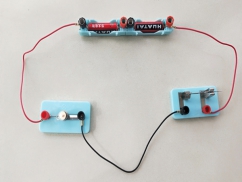 初中物理电学实验箱:电池盒、电池、开关、电流表、小灯泡、导线、小灯座。